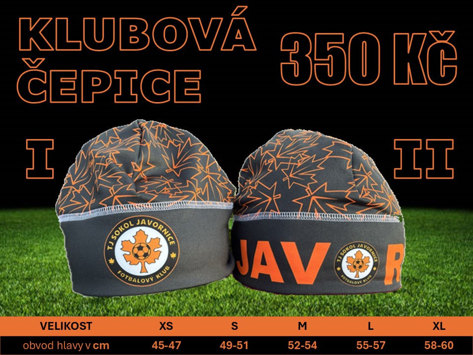 17.03.2026 20:35Přestože zima se pomalu ale jistě blíží ke svému konci, určitě se vyplatí být na chladné počasí správně připraven. K tomu vám může posloužit nová klubová čepice, kterou jsme v rámci zimní přípravy vybavili i naše hráče. Objednávat je můžete u Adama Krejčího (tel. 731 270 615 nebo e-mail: krejc.adam@seznam.cz). Vybírat můžete ze 2 variant - var. I pouze s logem, var. II s nápisem JAVORNICE a z 5 velikostí (XS-XL - viz tabulka dole). Variantu I je na přání možné vzadu doplnit o iniciály, číslo apod.