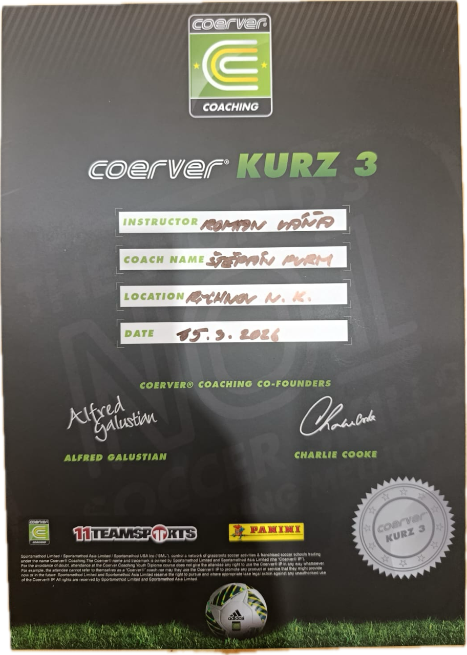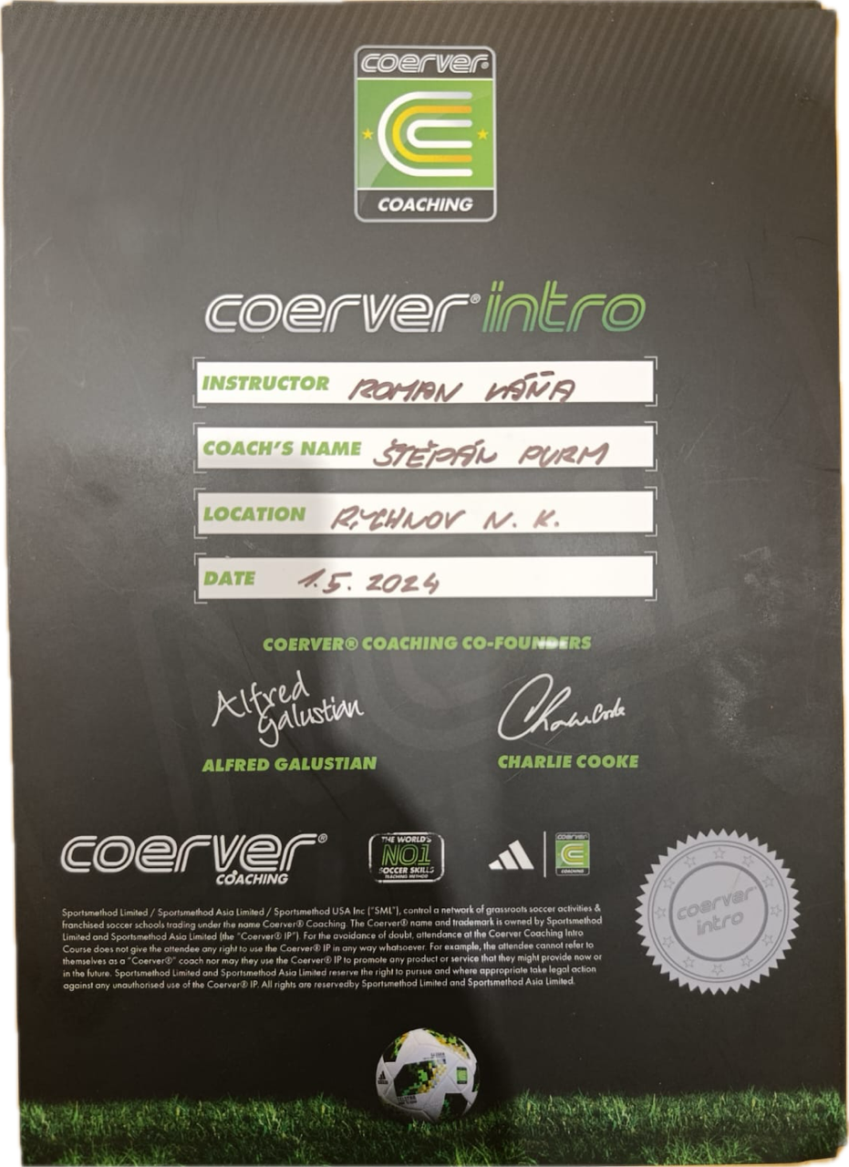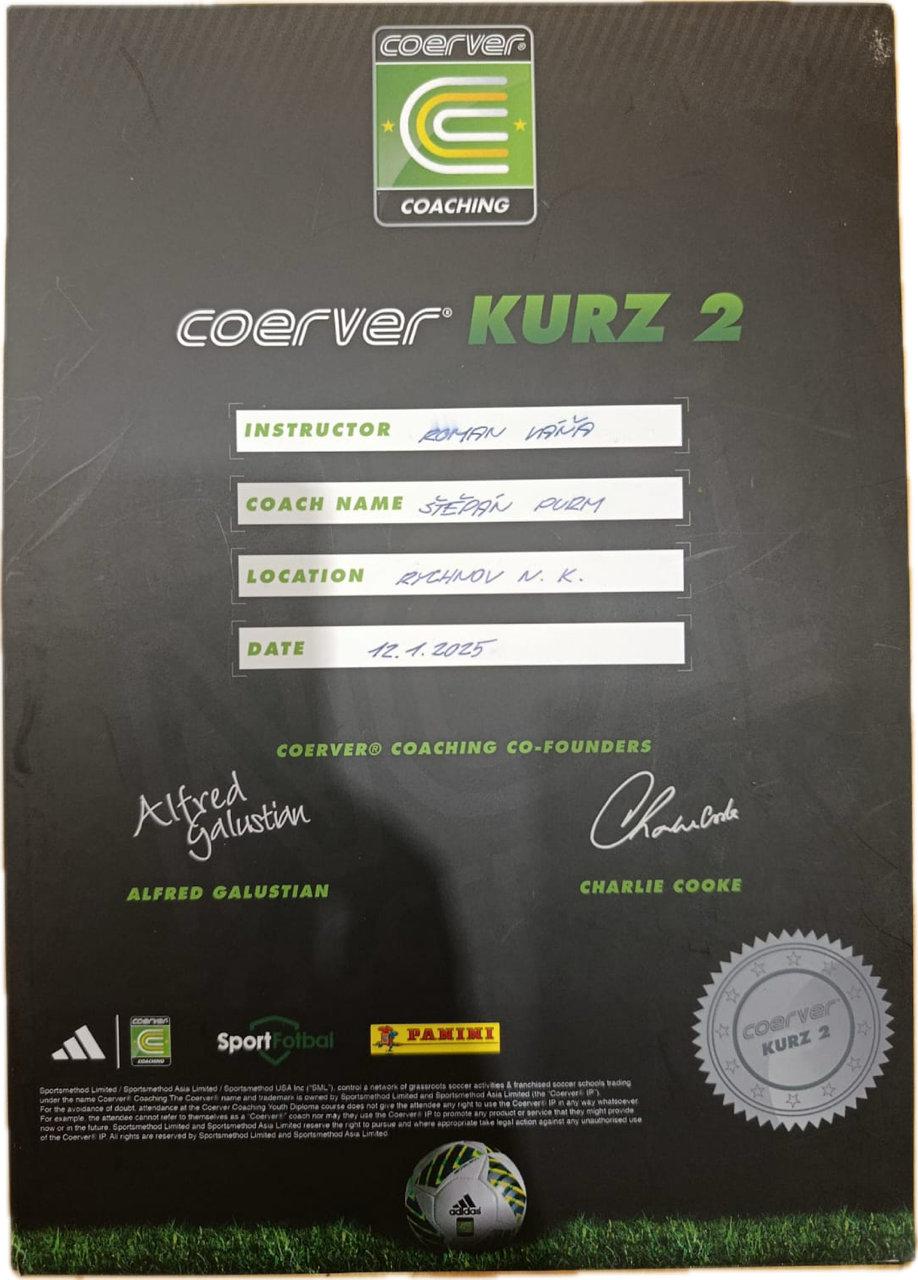 17.03.2026 21:11Po více než dvouletém teoretickém i praktickém studiu získal náš mládežnický trenér Štěpán Purm třetí a nejvyšší úroveň certifikace Coerver coaching! Tato moderní tréninková metoda staví na systematickém rozvoji individuálních dovedností s cílem vychovat technicky silné, tvořivé a samostatné fotbalisty, kteří umí efektivně kombinovat i prosadit se jeden na jednoho. Štěpánovi gratulujeme a děkujeme za jeho nezpochybnitelnou práci v našem klubu! Věříme, že své znalosti a získané dovednosti bude moct předávat ještě velké spoustě našich fotbalových nadějí.